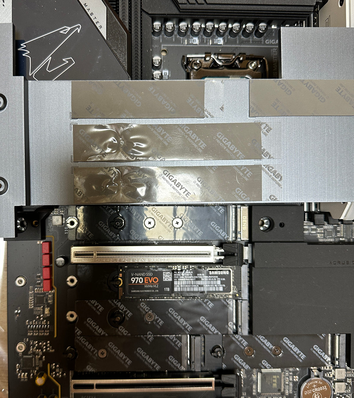 그래픽카드를 장착하기 위한 PCIe 포트 위에 있는 M.2의 경우 PCIe5.0 x4를 지원하는데, 해당 위치의 M.2 슬롯을 사용하게 되면 그래픽카드 슬롯에 있는 PCIe5.0 x16의 속도가 그 절반인 PCIe5.0 x8로 작동하게 되어있기에 그래픽 카드 하단부에 있는 M.2슬롯을 사용하여 NVME SSD를 장착하였습니다. 사실상 그래픽카드 부분의 PCIe5.0이 x8이 되어도 이전 버전인 PCIe4.0 x16과 동일한 속도를 가지기 때문에 PCIe5.0을 지원하는 M.2 NVME를 장착하여도 상관없지만 굳이 PCIe3.0을 지원하는 삼성 970 EVO를 PCIe5.0에 장착할 필요성을 느끼지 못했다라는 점이 더 크겠네요.