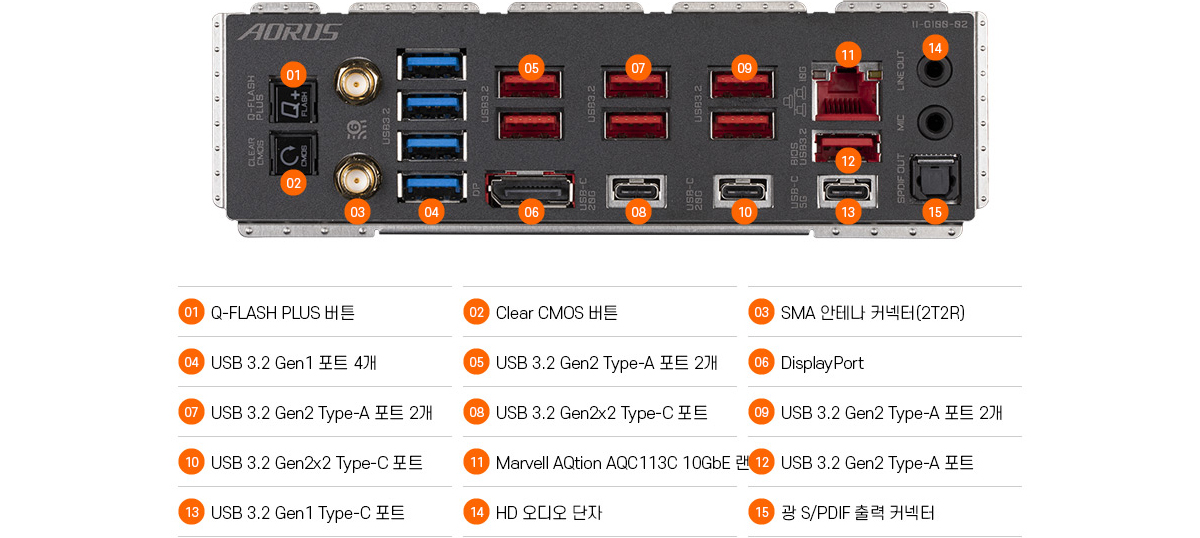 후면 포트의 구성을 보면 08, 10, 13번이 USB TYPE-C로 되어있는데, 이 중에 08과 10번이 USB 3.2 GEN2x2인 20Gbps의 속도를 지원하고, 13번의 경우 USB 3.2 GEN1인 5Gbps의 속도를 지원합니다. 물론 20Gbps의 속도도 빠르긴 하지만 40Gbps를 지원하는 썬더볼트에는 못미치겠죠. 단순하게 속도로만 따져볼 것이 아닌 다양한 포트를 구성하는 멀티 허브 같은 장비도 지원하구요. USB 3.2 GEN2x2를 하나 줄이고 그곳에 썬더볼트를 넣었으면 어땠을까 생각합니다. 이 부분은 현재 CPU와 연결된 M.2 PCIe5.0과 PCIe5.0 x16의 레인으로 인해 적용을 못한건가 싶기도 해요.
