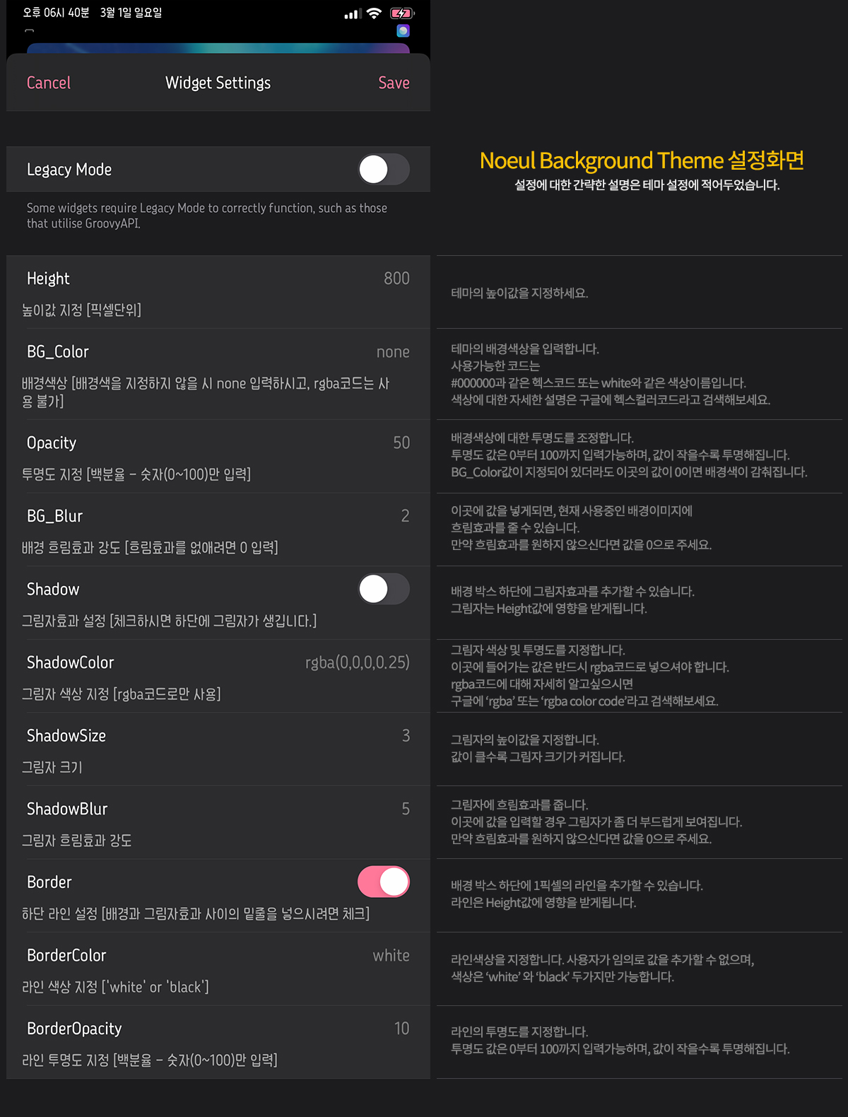 - 투명도 조절, 흐림효과 강도, 배경색상, 그림자 등등 다양한 테마설정을 제공합니다.